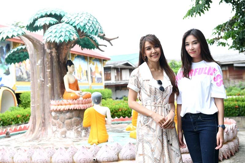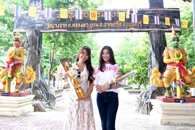 สองสาวนัดกันช่วงเช้า ณ วัดบางจาก ย่านปากเกร็ด ทั้งคู่มาในชุดขาวเรียบร้อย และบอกกับทีมข่าวว่าเป็นวัดประจำที่มาบ่อยมาก เพราะใกล้บ้านและที่ทำงาน จึงคุ้นเคยเป็นอย่างดี บรรยากาศวันนี้ก็เป็นใจไม่ร้อนมากจนเกินไปจึงเริ่มต้นชวนกัน จุดธูป-เทียน นำดอกไม้ไหว้พระประธาน พร้อมอธิษฐานจิตด้วยความตั้งใจจากนั้นทำบุญปิดทองลูกนิมิต และหยอดเงินร่วมทำบุญ ก่อนจะพากันเข้าอุโบสถหอบหิ้วเทียนพรรษาและหลอดไฟมาถวายแด่พระสงฆ์ หลังจากนั้นทั้งคู่ก็ชวนกันเดินชมพระอุโบสถที่สวยงามและงานรูปปั้นที่เกี่ยวข้องกับหลักคำสอนศาสนามากมายพร้อมตั้งจิตอธิษฐานถึง “พระพุทธมงคลชัย”พระพุทธรูปปางมารวิชัย ขนาดหน้าตัก19 เมตร สูง 27 เมตร ที่ตั้งเด่นอยู่บริเวณหน้าวัดบางจาก ติดริมแม่น้ำ ทำบุญเสร็จแล้วทั้งคู่ชวนทีมข่าวนั่งเรือข้ามฟากไปยังเกาะเกร็ดซึ่งตรงท่าน้ำวัดมีเรือข้ามฟากพอดี ค่าโดยสารคนละ 5 บาท งานนี้จึงลงเรือข้ามฟากชมบรรยากาศน้ำเจ้าพระยาอย่างฟินอากาศดีเป็นพิเศษจริงๆ และปิดท้ายทริปบุญในครั้งนี้ ด้วยการทำบุญให้อาหารปลาที่สร้างความสุขให้กับสองสาวอยู่ไม่น้อย