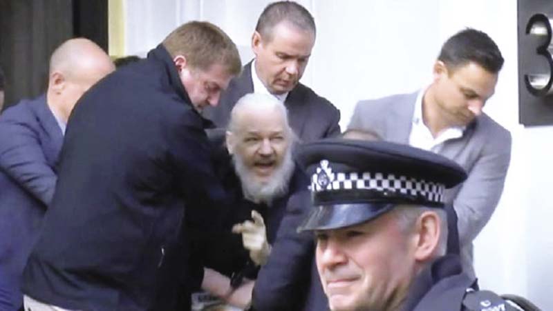 ปล่อยฉาน : วินาทีที่ จูเลียน แอสซานจ์ ผู้ร่วมก่อตั้งเว็บไซต์วิกิลีกส์ ในสภาพหนวดเครารุงรัง ถูกเจ้าหน้าที่ตำรวจนครบาลกรุงลอนดอน บุกรวบตัวถึงภายในอาคารสถานทูตเอกวาดอร์ในกรุงลอนดอน หลังเข้าไปลี้ภัยอยู่นานถึง 7 ปี