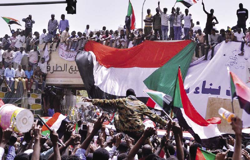 ขับไล่ : ผู้ชุมนุมชาวซูดานแบกทหารนายหนึ่งขึ้นบ่าและโห่ร้องด้วยความยินดี รวมถึงโบกธงชาติซูดาน บริเวณด้านนอกกระทรวงมหาดไทยในกรุงคาร์ทูม ภายหลังกองทัพประกาศการควบคุมตัวและยึดอำนาจบริหารประเทศ จากประธานาธิบดีโอมาร์อัล-บาเชียร์ ปิดฉากการปกครองประเทศแบบเผด็จการยาวนานกว่า 25 ปี