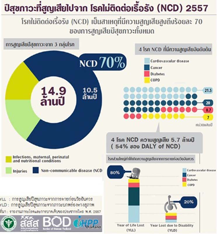 ศาสตราจารย์เกียรติคุณ แพทย์หญิงวรรณี นิธิยานันท์ ราชวิทยาลัยอายุรแพทย์แห่งประเทศไทย กล่าวว่า รายงานในปีพ.ศ.2557 พบว่า ร้อยละ 70 (10.5 ล้านปี จากทั้งหมด 14.9 ล้านปี) ของปีสุขภาวะที่คนไทยสูญเสีย เกิดจากโรคไม่ติดต่อเรื้อรัง หรือ NCDs (Non-Communication Diseases) โดยโรคที่พบเป็นสาเหตุบ่อยเรียงลำดับจากมากไปน้อย คือ โรคหลอดเลือดสมอง อัมพฤกษ์และอัมพาต โรคหลอดเลือดหัวใจ โรคมะเร็ง โรคเบาหวาน ความดันโลหิตสูงและโรคทางเดินหายใจเรื้อรัง กลุ่มโรค NCDs ทั้งหมดเกิดจากคนไทยดำรงชีวิตประจำวันทั้งการกินการอยู่แบบคนเมืองมากขึ้น นั่นคือ บริโภคอาหารปริมาณมาก แต่สัดส่วนและคุณภาพไม่เหมาะสม มีไขมันน้ำตาลและเกลือปริมาณมาก มีการเคลื่อนไหวร่างกายและกิจกรรมออกแรงน้อยลง ชีวิตเต็มไปด้วยความเครียดรีบเร่งและแข่งขัน แวดล้อมด้วยมลพิษ ยาสูบ แอลกอฮอล์ และสิ่งเสพติด