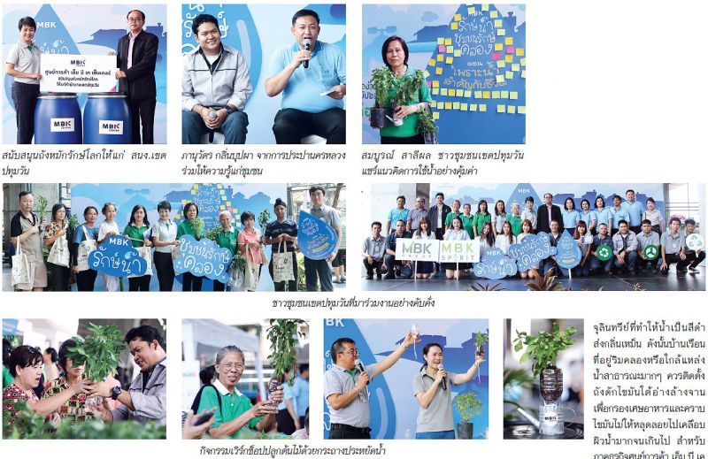 ศตกมล วรกุล ผู้อำนวยการฝ่ายสื่อสารองค์กร บริษัท เอ็ม บี เค จำกัด (มหาชน) เผยว่า ตลอดระยะเวลาการดำเนินงานมากว่า 34 ปี ศูนย์การค้า เอ็ม บี เค เซ็นเตอร์ได้ตระหนักถึงความสำคัญของทรัพยากรน้ำและปัญหามลพิษทางน้ำที่เกิดจากการทิ้งขยะลงสู่คูคลองในชุมชนโดยรอบอยู่เสมอ จึงได้มีการจัดกิจกรรมรณรงค์ในเรื่องการบริหารจัดการน้ำในชุมชนอย่างต่อเนื่อง เพื่อสร้างความร่วมมือในการอนุรักษ์แหล่งน้ำสาธารณะใกล้ตัว สอดคล้องกับกิจกรรมในครั้งนี้ได้จัดให้มีเสวนาให้ความรู้ด้านการบริหารจัดการน้ำภายในชุมชนและภายในอาคารโดยผู้เชี่ยวชาญ ตลอดจนเปิดพื้นที่แลกเปลี่ยนข้อเสนอแนะในการใช้น้ำอย่างรู้คุณค่า พร้อมมอบถังใส่น้ำหมักชีวภาพให้กับเขตปทุมวัน เพื่อใช้ฟื้นฟูน้ำเสียในชุมชนให้มีคุณภาพดีขึ้นโดยไม่พึ่งสารเคมี รวมทั้งจัดเวิร์กช็อปการปลูกต้นไม้ในกระถางประหยัดน้ำ ให้ชุมชนได้นำไปปรับใช้กับพื้นที่อยู่อาศัยของตัวเองได้ด้าน ภานุวัตร กลิ่นบุปผา หัวหน้าส่วนวางแผนและจัดการทรัพยากรน้ำฝ่ายทรัพยากรน้ำและสิ่งแวดล้อม การประปานครหลวง ร่วมให้ความรู้แก่ชุมชนถึงที่มาของน้ำเสียที่ถูกปล่อยออกมาจากครัวเรือน เริ่มจากคราบไขมันจากอาหารมีค่าความสกปรกสูงกว่าน้ำเสียที่ใช้ชำระล้างร่างกายในห้องน้ำมากกว่า 4 เท่า คราบไขมันที่ลอยอยู่เหนือน้ำเหล่านี้ ก็เป็นสาเหตุทำให้ออกซิเจนในน้ำลดลง เกิดจุลินทรีย์ที่ทำให้น้ำเป็นสีดำส่งกลิ่นเหม็น ดังนั้นบ้านเรือนที่อยู่ริมคลองหรือใกล้แหล่งน้ำสาธารณะมากๆ ควรติดตั้งถังดักไขมันใต้อ่างล้างจานเพื่อกรองเศษอาหารและคราบไขมันไม่ให้หลุดลอยไปเคลือบผิวน้ำมากจนเกินไป สำหรับภาคธุรกิจศูนย์การค้า เอ็ม บี เคเซ็นเตอร์ ภาคภูมิ เพ็ชรนิล เจ้าหน้าที่อาวุโสสุขาภิบาล ฝ่ายวิศวกรรมบริษัท เอ็ม บี เค จำกัด (มหาชน) หนึ่งในจิตอาสา MBK Spirit ได้เผยแนวทางการจัดการน้ำของศูนย์การค้า ที่คำนึงถึงการประหยัดทรัพยากร และความรับผิดชอบต่อสังคม อาทิ การทำโครงการปรับปรุงห้องน้ำทุกห้องให้ใช้สุขภัณฑ์แบบประหยัดน้ำและใช้วาล์วเปิด/ปิดน้ำ ระบบอัตโนมัติ โดยภายใน 1 ปี ลดการใช้น้ำประปาได้ถึง 102,651 หน่วย นอกจากนี้ทางศูนย์การค้าฯ ยังติดตั้งระบบบำบัดน้ำเสียจากการอุปโภคต่างๆ กลับมาใช้ใหม่ในรูปแบบการรดน้ำต้นไม้ ชำระล้างถนนโดยรอบ และมีการนำน้ำที่บำบัดแล้วส่งตรวจคุณภาพเป็นประจำ เพื่อควบคุมมาตรฐานความสะอาดให้อยู่ภายใต้ข้อกำหนดของกรมควบคุมมลพิษไม่ส่งผลกระทบกับชุมชนรอบข้างเมื่อถูกปล่อยออกสู่สาธารณะ ส่วนชุมชนรักษ์คลอง สมบูรณ์ สาลีผล 