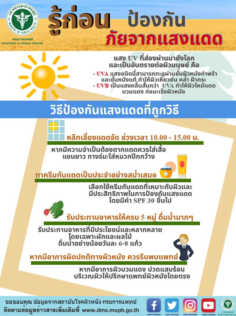 นายแพทย์ณรงค์ อภิกุลวณิช รองอธิบดีกรมการแพทย์ และโฆษกกรมการแพทย์ กล่าวว่าแสงแดดมีคุณประโยชน์ แต่ขณะเดียวกันก็มีโทษมหันต์หากได้รับในปริมาณที่มากเกินไป ช่วงเวลาที่ทำให้เกิดอันตรายต่อผิวหนังมากที่สุดคือ ช่วงแดดจัดๆ ตั้งแต่เวลา 10.00-15.00 น. โดยอันตรายจากแสงแดดที่สังเกตได้ เช่น มีอาการผิวไหม้แดง แสบร้อนทุกครั้งที่ออกแดด แสงแดดประกอบด้วยแสงหลากหลายชนิด ซึ่งแสงที่ทำให้เกิดอันตรายต่อผิวหนังมากที่สุด คือ แสงอัลตราไวโอเลต หรือที่เรียกว่า UV มีผลทำให้ผิวแดงไหม้ ผิวคล้ำ ผิวแห้งกร้าน เป็นฝ้า ตกกระ แก่ก่อนวัย และอาจก่อให้เกิดโรคมะเร็งของผิวหนังได้ในระยะยาว