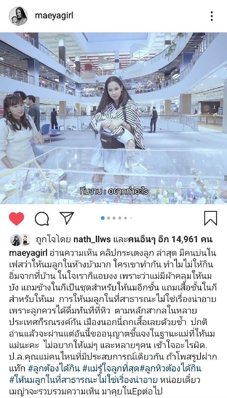 อัปเดตชีวิตหลังแต่งของสาว “เมญ่า-นนธวรรณ ฌรรวนธร” เจ้าของตำแหน่งมิสไทยแลนด์เวิลด์ 2014 หลังวิวาห์กับแฟนหนุ่มนักธุรกิจรักต่างวัย 19 ปี ล่าสุดบินกลับมาเยี่ยมเมืองไทย พร้อม “น้องเบฬิน” ลูกชายวัย 8 เดือน มาเปิดประสบการณ์ในแบบฉบับของ รายการออนไลน์ “กระเตงลูก”รายการที่เผยไลฟ์สไตล์ของคุณแม่เมญ่ากับวิถีการเลี้ยงลูก แต่สิ่งที่ทำเอาหลายคนหลงก็เพราะความหล่อ น่ารักน่าเอ็นดูของลูกชาย ที่เห็นแล้วละลายเลย แถมแม่เมญ่ายังการันตีว่าลูกคนนี้เลี้ยงง่ายอีกต่างหาก แต่หลังจากคุณแม่สายนางงามได้ปล่อยคลิปความน่ารักของลูกชายไปแล้ว ก็แอบมีหลายคนดราม่าถึงการกระทำของแม่ ที่ให้นมลูกชายกลางห้างว่าไม่เหมาะสม งานนี้ทำเอาเลือดความเป็นแม่พลุ่งพล่าน เจ้าตัวถึงกับออกมาโต้กลับกลางคอมเมนท์ และไอจีส่วนตัวว่า “การให้นมลูกในที่สาธารณะไม่ใช่เรื่องน่าอาย เพราะลูกควรได้ดื่มทันทีที่หิว” อูย!!! บอกเลยว่าเผ็ด แซ่บตามสไตล์แม่จริงๆเลยค่ะคุณขา ตามไปดูคลิปต้นเหตุ ได้ที่ https://www.youtube.com/watch?v=AKTXlsODAL0