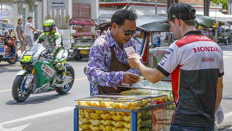 The day began for Lorenzo at Wat Pho – the temple of the reclining Buddha – where the five-time World Champion was able to wander around the incredible complex, taking in some history and even posing for a few selfies with fans. Crutchlow, meanwhile, began at Tha Tian Market nearby, where the Brit headed into the maze of incredible sights and smells of the place. They both came across a famous local face too, as Chantra visited the temple and the market before the trio regrouped.