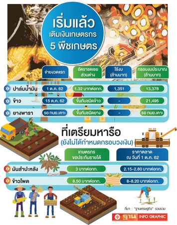 The government has started the transfers of guaranteed income into farmers’ accounts via the Bank for Agriculture and Agricultural Co-operatives, at the rate of Bt1.32 per kilogram or Bt497.49 per rai, but not exceeding 25 rai in total farming area per household. It handed out a maximum of Bt11,987.25 per farmer in the first installment on October 1. In total, the transfers will amount to Bt1,351 million.