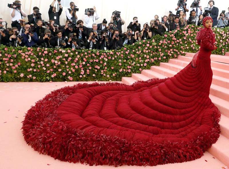 ชุดสุดอลัง : คาร์ดี บี ศิลปินสาวอเมริกัน โชว์ชุดราตรีหางยาวประดับขนนกสีแดง ที่ส่วนปลายของชุด ผลงานดีไซเนอร์ ทอม บราวน์ ก่อนเข้าร่วมงานประกาศผลรางวัล เม็ต กาลา อวอร์ดส์ ที่นครนิวยอร์ก