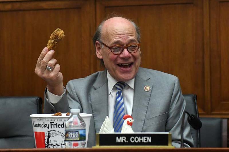 กินไก่ : สตีฟ โคเฮน สมาชิกสภาผู้แทนราษฎรพรรคเดโมแครตจากรัฐเทนเนสซี กินไก่ทอดโชว์สื่อระหว่างเป็นกรรมาธิการยุติธรรมสภาผู้แทนราษฎร ในการไต่สวนรัฐมนตรีกระทรวงยุติธรรมสหรัฐ กรณีรัสเซียแทรกแซงการเลือกตั้งประธานาธิบดีสหรัฐ ปี 2016