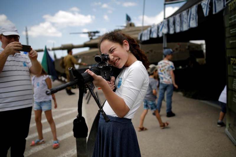 เล็งหน่อย : เด็กสาวชาวยิวเล็งปืนไรเฟิลด้วยท่าทางทะมัดทะแมงระหว่างเข้าร่วมกิจกรรมวันอนุสรณ์แห่งชาติ รำลึกถึงทหารที่สละชีวิต ที่อนสรณ์สถานทหารชาวยิวในกรุงเยรูซาเลม ของอิสราเอล
