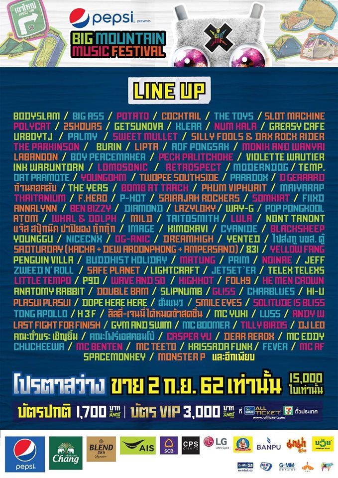 เตรียมตัวให้พร้อมแล้วไปสนุกด้วยกัน กับงาน เป๊ปซี่ พรีเซนต์ บิ๊ก เมาน์เท่น มิวสิค เฟสติวัล ครั้งที่10 พร้อมเปิดจำหน่ายบัตรโปรตาสว่าง คุ้มและถูกที่สุด ก่อนขายรอบ Early Cowบัตรปกติ1,700 บาท (จาก 2,500 บาท) และ บัตร VIP3,000 บาท (จาก3,500 บาท)ราคานี้ขายวันจันทร์ที่ 2 กันยายน นี้ วันเดียวเท่านั้น!จำนวนจำกัด15,000 ใบเท่านั้น! ซื้อบัตรได้ที่เคาน์เตอร์เซอร์วิส ออลล์ ทิคเก็ต ในร้านเซเว่นอีเลฟเว่น ทุกสาขาทั่วประเทศ หรือ http://www.allticket.com สามารถติดตามรายละเอียดเพิ่มเติมได้ที่ FB : BigMountainMusicFestival#BMMFX#PEPSIBMMFX