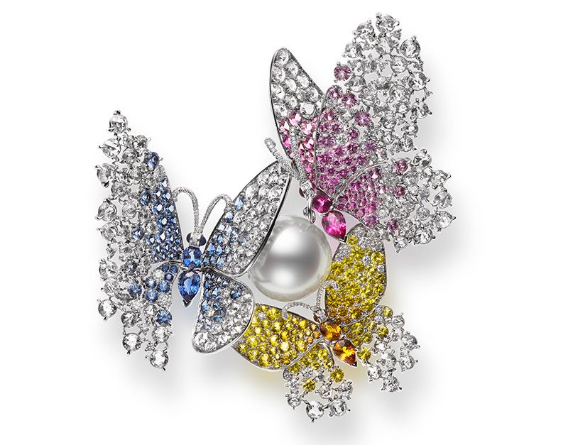 คอลเลคชั่นมาสเตอร์พีซ Mikimoto High Jewelry 2019 มีทั้งต่างหู เข็มกลัด และสร้อยคอ ล้วนเลิศหรูอลังการ อย่างเข็มกลัดไข่มุกเซาธ์ซีส์สีขาวประดับเพชรและพลอย ดีไซน์เป็นผีเสื้อตกแต่งด้วยเพชรและพลอยสีชมพู พลอยสีน้ำเงินและพลอยสีเหลืองทั้ง 3 ตัวเกาะอยู่บนไข่มุกเซาธ์ซีส์ (โดยตัวเรือนทำจากทองคำขาว) ส่วนต่างหูมี 2 แบบ ทั้งต่างหูเพชรสุดหรูที่นำพลอยสีต่างๆ ทั้งโกเมน ไพลิน นิล มรกต และเพชรมาเกาะเกี่ยวกันเป็นช่อและห้อยพลอยสีชมพูเม็ดใหญ่งามแปลกตา หรือจะชอบต่างหูไข่มุกเซาธ์ซีส์เม็ดใหญ่ประดับเพชรที่ทำเป็นดอกไม้เล็กๆ4 ดอก เกี่ยวร้อยกันอย่างสวยงาม