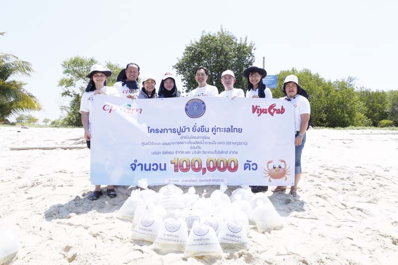 สาธิต แสงเรืองอ่อน และ ทิวากร จงมีความสุข ผู้ช่วยกรรมการผู้จัดการพร้อมด้วยคณะผู้บริหาร และพนักงาน บริษัทซีพีแรม จำกัด ร่วมกับกรมประมง โดยศูนย์วิจัยและพัฒนาประมงชายฝั่งสุราษฎร์ธานี และ บริษัท วิยะเครปโปรดักส์ จำกัด ทำกิจกรรมอนุรักษ์พันธุ์สัตว์น้ำทะเล ในโครงการปูม้า ยั่งยืน คู่ทะเลไทย เพื่อเพิ่มปริมาณปูม้าในพื้นที่บริเวณชายฝั่งจังหวัดสุราษฎร์ธานี