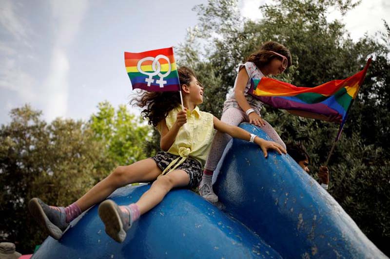 ยิ้มแย้ม : เด็กสาวสองคนเล่นสนุกพร้อมธงสีรุ้งในมือ ระหว่างเข้าร่วมกิจกรรมชุมนุมประจำปีของกลุ่มสนับสนุนรักเพศเดียวกัน ที่นครเยรูซาเลม ประเทศอิสราเอล