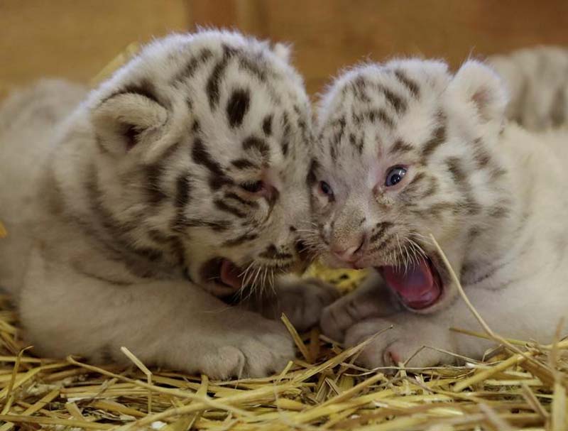 ลืมตาดูโลก : ลูกเสือขาวเบงกอลสองตัวที่เพิ่งลืมตาดูโลกเมื่อต้นเดือนพฤษภาคมที่ผ่านมา ถูกนำออกมาโชว์ตัวต่อสื่อมวลชนได้ถ่ายภาพครั้งแรกที่สวนสัตว์ไวต์ ซู ในเมืองเคิร์นฮอฟ ประเทศออสเตรีย
