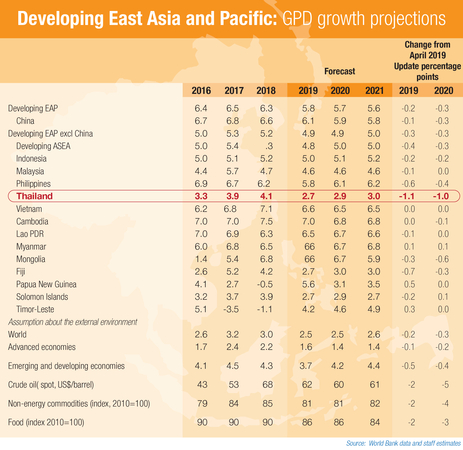 Kiatipong Ariyapruchya, senior country economist of the World Bank revealed on Thursday (October 10) that the World Bank had adjusted Thailand’s GDP forecast down to 2.7 per cent in 2019 and 2.9 per cent in 2020.