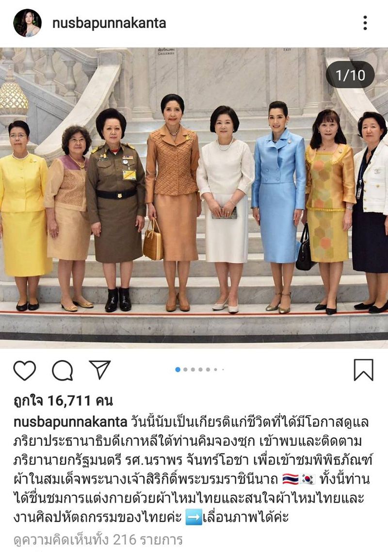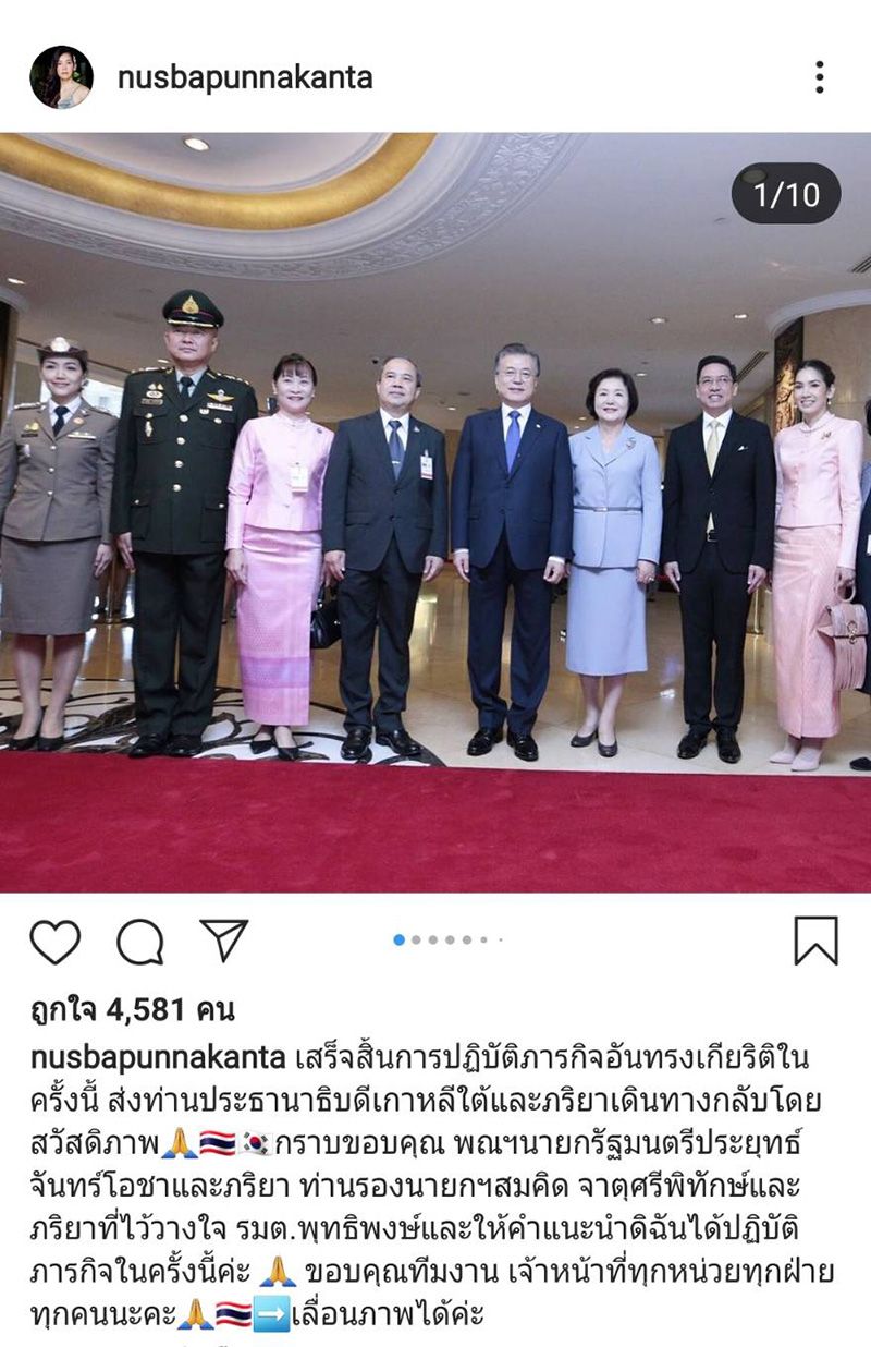 ล่าสุด เจ้าตัวได้โพสต์ภาพการปฎิบัติหน้าที่อันทรงเกียรติร่วมกับสามี นั่นก็คือการต้อนรับประธานาธิบดีเกาหลี “มุน แช อิน” และภริยา “คิมจองซุก” เยือนประเทศไทยอย่างเป็นทางการ รวมถึงการทำหน้าที่ดูแลภริยาระหว่างที่อยู่ในไทย ซึ่งงานนี้เจ้าตัวได้ทำหน้าที่ได้อย่างดี ไม่มีที่ติ อาทิ ดูแลท่านคิมจองซุก เข้าพบและติดตามภริยานายกรัฐมนตรี รศ.นราพร จันทร์โอชา เพื่อเข้าชมพิพิธภัณฑ์ผ้าในสมเด็จพระนางเจ้าสิริกิติ์พระบรมราชินีนาถ