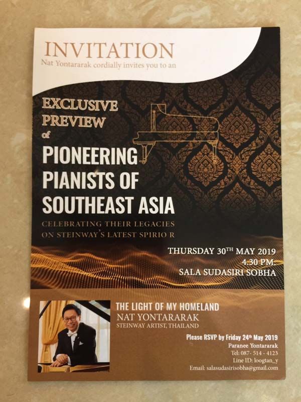 คืองาน An Exclusive Preview ofPioneering Pianists of Southeast Asiaงานนี้ก็คือบริษัท Steinway Piano จัดขึ้นที่สิงคโปร์ จัดเป็นคอนเสิร์ตซีรี่ส์ ตั้งชื่อว่า Pioneering Pianists of Southeast Asia หรือนักเปียโนผู้บุกเบิกของเอเชียตะวันออกเฉียงใต้ เขาเชิญนักเปียโนจาก 2 ประเทศ คือฟิลิปปินส์และไทย ส่วนประเทศไทยผมก็ได้รับเชิญไปครับ เขาขอให้เราเล่นเพลงที่เป็นเอกลักษณ์ของชาติผมจึงใช้ชื่อช่วงของผมว่า The Light of My homeland by Nat Yontrararak ที่ต้องการบอกถึงแสงประทีปสำหรับของบ้านเมืองของเราผมจึงเชิญบทเพลงพระราชนิพนธ์ของในหลวงรัชกาลที่ 9 สองบทคือ Somewhere Somehow และ Love in Spring แล้วผมก็ถึงเพลงที่เกี่ยวกับชาติบ้านเมืองของเรา จึงนึกถึงเพลงของพลเอกเปรมที่เล่นด้วยเปียโนแบบสี่มือ ที่เคยเล่นกับลูกนัท (ลูกชายคนโต) คือเพลง เกิดมาต้องตอบแทนบุญคุณแผ่นดิน ซึ่งคำนี้เป็นภาษิตประจำตัวของท่าน ท่านเคยบอกทุกๆ คนในเรื่องนี้ว่า ท่านแต่งเพลงนี้ไว้เพื่อให้ทุกคนต้องตอบแทนบุญคุณแผ่นดิน ผมเห็นว่าเหมาะมากกับชื่อคอนเสิร์ต จึงนำเพลงนี้ไปบรรเลงด้วย และเมื่อช่วงกลางเดือนพฤษภาคม ก่อนที่ท่านจะถึงแก่อสัญกรรมประมาณ 1 สัปดาห์ ผมเขียนจดหมายไปกราบเรียนท่านว่า ผมจะนำเพลงนี้ไปแสดงที่สิงคโปร์ กราบขออนุญาตท่านด้วย ท่านตอบว่าดีใจมากและอนุญาต แล้วผมยังกราบเรียนเชิญท่านไปฟังเพลงนี้ที่จะบรรเลงก่อนที่ศาลาสุทธสิริโสภาในวันพฤหัสบดีที่ 30 พฤษภาคมด้วย แต่ท่านก็จากพวกเราไปเสียก่อนครับ ผมมีเรื่องเรียนเพิ่มเติมอีกนิดหน่อยสำหรับคอนเสิร์ตที่สิงคโปร์ คือผมจะนำส่วนหนึ่งของ Sonata ถวายชัยกิตติมหาราชา ซึ่งท่อนที่นำไปแสดง คือท่อนสุดท้ายชื่อว่า ฑีฆายุโกโหตุมหาราชา ผมเห็นว่าเหมาะสมกับเหตุการณ์ปัจจุบันมาก เพราะประเทศเรามีพระเจ้าแผ่นดินพระองค์ใหม่ เพิ่งมีพระราชพิธีพระบรมราชาภิเษก แล้วอีกบทหนึ่งมาจากสยามโซนาตา เป็นเรื่องราวของภาคใต้ของเราเพราะว่าสิงคโปร์อยู่ใกล้กับภาคใต้ของเรา ส่วนอีกบทเพลงหนึ่งเป็นบทเพลงใหม่เพิ่งแต่งขึ้น เป็นบทเพลงซึ่งนำเค้าโครงมาจากพระคัมภีร์เรื่องบุตรน้อยหลงหาย ทุกคนที่เป็นคริสเตียนรู้จักดีเรานำมาเล่นท่อนเดียวในการแสดง โดยมีเครื่องให้จังหวะคือตะโพนของเรา โดยจะแสดงคล้ายๆ ลิเก มีการออกแขกด้วย แต่ทุกอย่างมีตัวแสดงหลักคือ เปียโน