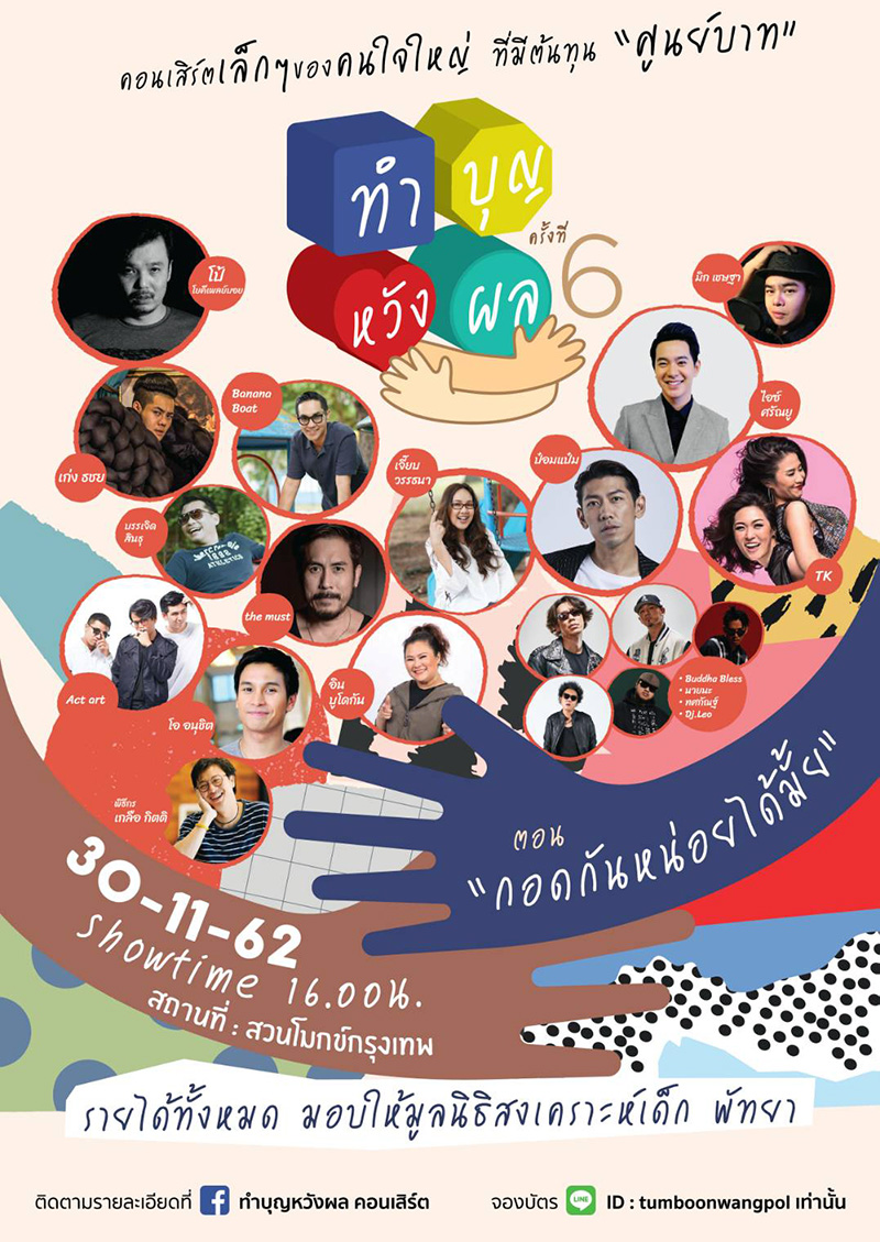 04ก.ย.2562 ผู้สื่อขาวรายงานว่า ได้รับแจ้งจากบริษัทประชาสัมพันธ์กลุ่มศิลปินที่ใช้ชื่อว่าทำบุญหวังผล ได้เตรียมรวมตัวจัดแสดง คอนเสิร์ตเล็กๆ ของคนใจใหญ่ ที่มีต้นทุน “ศูนย์บาท” ขึ้นอีกครั้งเป็นครั้งที่ 6 โดยในปีนี้มาในตอน “กอดกันหน่อยได้มั้ย” นำโดยศิลปิน และโปรดิวเซอร์มากความสามารถอย่าง เจี๊ยบ วรรธนา วีรยวรรธน และ บานาน่า โบ๊ต จึงประกาศชวนคนดูมากอด และนั่งเล่นฟังเพลงกันกลางสวน ฟินไปกับความสุขของศิลปินเพลงต่างๆและได้ทำบุญสร้างกุศลไปพร้อมกันอย่างเต็มอิ่มกันกว่า 30 เพลง จากศิลปินใจบุญกว่า 20 ชีวิต ไม่ว่าจะเป็นเจ้าของโปรเจกต์อย่าง เจี๊ยบ วรรธนา และ บานาน่า โบ๊ต ตามด้วย ป๋อมแป๋ม, โป้ โยคีเพลย์บอย, Triumphs Kingdom, โอ อนุชิต, ไอซ์ ศรันยู, เก่ง ธชย, อิน บูโดกัน, THE MUST, ActArt, บรรเจิด สินธุ, เชษฐา ยารสเอก, บุดด้า เบลส, นายนะ, ทศกัณฑ์, Dj.Leo และ เกลือ กิตติ แล้วอย่าลืมมากอดกันใน คอนเสิร์ต ทำบุญหวังผล 6 วันเสาร์ที่ 30 พฤศจิกายน 2562 ณ สวนโมกข์ กรุงเทพ เปิดจองบัตรวันศุกร์ที่ 6 กันยายนนี้ ผ่าน LINE ID: tumboonwangpol ช่องทางเดียว!! บัตรราคาเดียว 1,000 บาท รายได้ทั้งหมดมอบให้ มูลนิธิสงเคราะห์เด็ก พัทยา ติดตามข้อมูลเพิ่มเติมได้ที่ เฟซบุ๊ค “ทำบุญหวังผล คอนเสิร์ต” http://www.facebook.com/tumboonwangpol