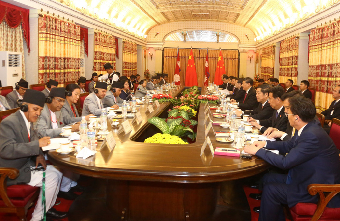 About an hour after landing at Tribhuvan International Airport at 4:46 pm, Xi started his official engagements, beginning with delegation-level talks with President Bidya Devi Bhandari.