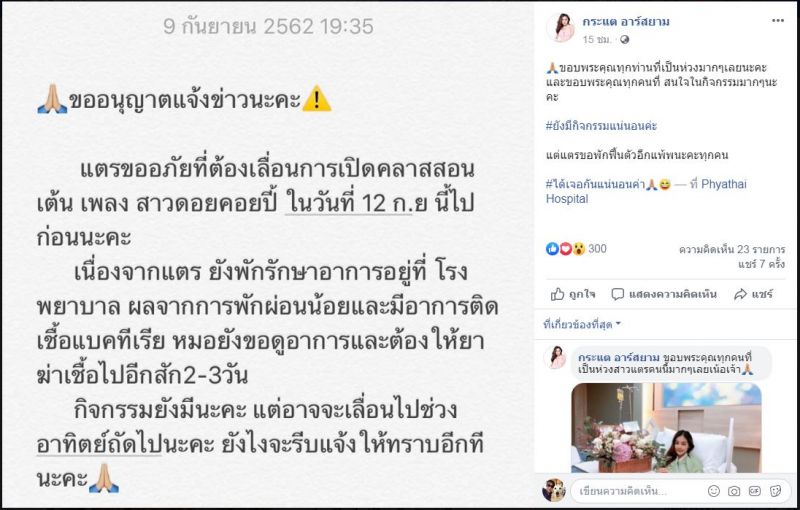 “ขออนุญาตแจ้งข่าวนะคะ แตรขออภัยที่ต้องเลื่อนการเปิดคลาสสอนเต้น เพลง สาวดอยคอยปี้ ในวันที่ 12 ก.ย. นี้ไปก่อนนะคะ เนื่องจากแตร ยังพักรักษาอาการอยู่ที่โรงพยาบาล ผลจากการพักผ่อนน้อย และมีอาการติดเชื้อแบคทีเรีย หมอยังขอดูอาการและต้องให้ยาฆ่าเชื้อไปอีกสัก 2-3 วัน กิจกรรมยังมีนะคะ แต่อาจเลื่อนไปช่วงอาทิตย์ถัดไปนะคะ ยังไงจะรีบแจ้งให้ทราบอีกทีนะคะ”