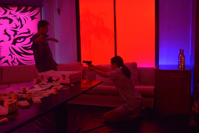ฉากดังกล่าว ผู้กำกับฯ และทีมงานปักหลักถ่ายทำกันที่บ้านสามวา เนรมิตให้เป็นห้องปาร์ตี้ โดยเริ่มถ่ายเก็บภาพปาร์ตี้ในมุมต่างๆ ก่อน จากนั้นมาถ่ายคิวของ “ลูกเกด” ที่ต้องสวมชุดแม่บ้านสาวเข็นรถเครื่องดื่มเข้ามาในห้อง ระหว่างเดินเข้ามาลูกสมุนของ “เดย์” ก็เข้ามาลวนลาม “ลูกเกด”มือปืนคุณแม่ลูกหนึ่ง จึงจับแขนคว้าปืนออกมายิงสวนไปที่เหล่าสมุนจนตายเรียบในแบบแม่นยำ โดยในฉากนี้ นักแสดงทั้งหมดทำการเวิร์กช็อปกันมาก่อนแล้ว จึงค่อนข้างรู้จังหวะกันเป็นอย่างดีโดยเฉพาะ “ลูกเกด” ที่ต้องลุยเดี่ยวปะทะลูกสมุนของ เดย์ ด้วยท่วงท่าที่คล่องแคล่ว แต่ที่ทำให้ “ลูกเกด” มีปัญหาเล็กน้อยตรงที่เสียงเอฟเฟกท์ปืนที่ค่อนข้างดัง สาวเกดจึงขอทำใจอยู่นานกว่าจะถ่ายได้ เมื่อถ่ายด้านในห้องเสร็จจึงย้ายมาถ่ายต่อกันด้านนอก กับซีนที่ “ลูกเกด” ต้องปะทะกับ “หนุ่มเดย์” ก่อนถ่ายทำมีการซักซ้อมมุมรับ-ส่งกันก่อน สักพักผู้กำกับฯ ก็สั่งเดินกล้องถ่ายทำทันทีติดตาม “สวย รหัสฆ่า Blood Valentine”ออกอากาศให้ได้ชมทางช่อง “MONO29”(โมโนทเวนตี้ไนน์) เร็วๆ นี้