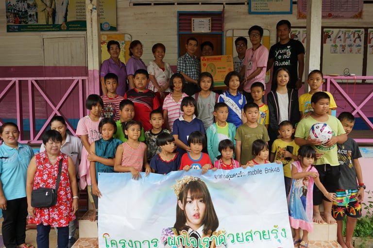 เป็นเรื่องราวดีๆ ที่ถูกเปิดเผยภาพและถูกแชร์บนโลกโซเชียล เกี่ยวกับเรื่องราวของครูอุ้ม หรือ สุทธิลักษณ์ กันธิพันธ์ ครูดอยโรงเรียนป่าเมี่ยงแม่พริก ต.แม่สรวย จ.เชียงราย ผู้เสียสละเพื่อเด็ก ยอมทิ้งความสุขส่วนตัวมาใช้ชีวิตอุทิศต่อการทำงานสังคม เพื่อสอนหนังสือเด็กชาวเขา ทั้งยังฝ่าฟันอุปสรรคอย่างไม่เคยย่อท้อต่อความยากลำบาก จนเรื่องราวรู้ถึงกลุ่มคนรักโมบายbnk48เชียงใหม่ จึงเกิดโครงการผูกใจเราด้วยสายรุ้งปันรักให้น้องครั้งที่ 1กับเหล่าบรรดาแฟนคลับ น้องโมบายbnkรวมถึง ไก่- จีรทีปต์ มือกลองวงอัลไซเมอร์ ได้ร่วมกับเหล่าบรรดาสาวก รวมเงิน ข้าวของเครื่องใช้ เดินทางส่งมอบกำลังใจไปช่วยครูอุ้ม