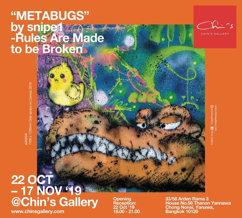 Renowned Japanese artist Snipe1 brings his graffiti art to Thailand for the exhibition “METABUGS – Rules are meant to be broken” opening at Chin’s Gallery in downtown Bangkok on October 22.