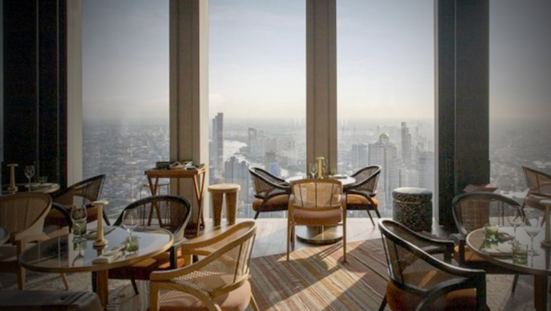Perched heavenward on the 76th floor of King Power Mahanakhon in Sathorn district, the SkyBar tempts with starters including cured Norwegian salmon, grilled Nan pork jowl and a vegetarian grain salad.
