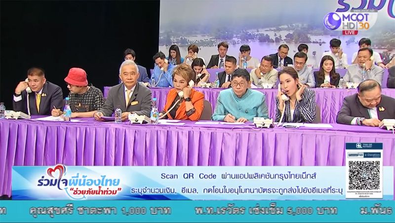 20 กันยายน 2562 หลังจากที่ พล.อ.ประยุทธ์ จันทร์โอชา นายกรัฐมนตรี และรมว.กลาโหม นำคณะรัฐมนตรี (ครม.) ดารา นักร้อง นักแสดง รวมถึง นายบิณฑ์ บรรลือฤทธิ์ นักแสดงชื่อดังและอาสากู้ภัย ร่วมรับมอบเงินบริจาคช่วยเหลือผู้ประสบอุทกภัย ผ่านรายการพิเศษ “ร่วมใจ พี่น้องไทย ช่วยภัยน้ำท่วม” ซึ่งจัดโดยสำนักนายกรัฐมนตรี อสมท และกรมประชาสัมพันธ์ โดยเปิดโอกาสให้ประชาชนทุกภาคส่วนมีส่วนร่วมในการช่วยเหลือผู้ได้รับผลกระทบจากเหตุอุทกภัย ทั้งหมด 30 คู่สาย โดยจะมีนักการเมือง ดารา นักแสดง ร่วมรับสาย อาทิ พล.อ.ประวิตร วงษ์สุวรรณ, นายวิษณุ เครืองาม, หนิง ปณิตา, บุ๋ม ปนัดดา, ต้อย หมวกแดง ฯลฯ