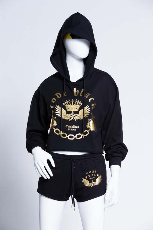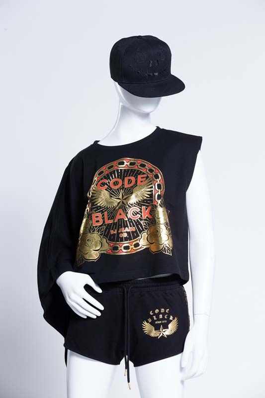สำหรับสุขภาพสตรีที่ชื่นชอบการตัวสายสตรีทแฟชั่น มีให้เลือก 3 ดีไซน์ ประกอบด้วยเสื้อฮู้ดดี้ เสื้อแขนสั้นเอวลอย และเสื้อเอวลอยแบบมีแขนเสื้อด้านเดียว โชว์ความเซ็กซี่เล็กๆ ดึงดูดสายตาด้วยลายสกรีน คำว่า “Code Black” สีทองเงา จัดวางอยู่ในรูปลักษณ์ที่แตกต่างบนพื้นผ้าคอตตอนสีดำ เพื่อสร้างความน่าสนใจให้ลุคดูแกลมยิ่งขึ้นเมื่อสวมใส่