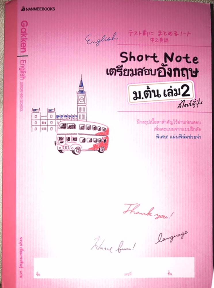 “Short Note เตรียมสอบอังกฤษ” เป็นหนังสือแบบฝึกหัดจากสำนักพิมพ์ นานมีบุ้คส์ ที่ตั้งเป้าหมายไว้เพื่อช่วยให้นักเรียนในระดับมัธยมต้นที่ต้องเคร่งเครียดกับวิชาการหลากหลายให้บรรเทาความเครียดลงได้บ้างในวิชาภาษาอังกฤษ โดยนำเอาบทเรียนและแบบฝึกหัดในการเรียนรู้ภาษาอังกฤษตามสไตล์การเรียนของเด็กญี่ปุ่นมานำเสนอให้เด็กไทยทำตาม ซึ่งจะทำให้เข้าใจง่าย และจดจำได้รวดเร็วยิ่งขึ้น จำหน่ายเล่มละ 225 บาท วางตลาดแล้ว เล่มที่ 1 และ 2