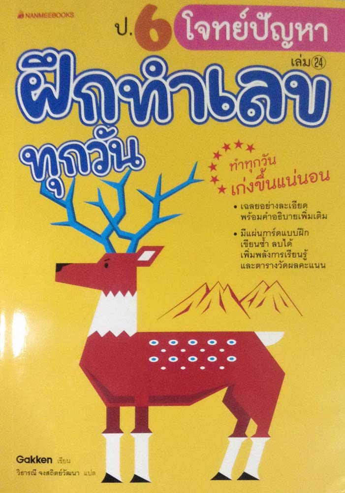 “โจทย์ปัญหา ฝึกทำเลขทุกวัน” เป็นชุดฝึกหัดที่เขียนขึ้นโดย “GAKKEN” นำมาแปลเป็นภาษาไทยโดย “วิธารณี จงสถิตย์วัฒนา” โดยมีความเชื่อว่า การฝึกคิดตัวเลข การทำแบบฝึกหัดคณิตศาสตร์ทุกวัน ทุกคนจะเก่งขึ้นอย่างแน่นอน หนังสือเล่มนี้ จึงมีการนำแบบฝึกหัดมาให้เด็กฝึกหัดทำ โดยมีการบอกวิธีการคิดเลขสมัยใหม่ที่เข้าใจง่าย พร้อมมีแบบฝึกหัดและคำเฉลยให้ทราบในทุกๆ โจทย์ปัญหา ซึ่งง่ายต่อการเรียนรู้ด้วยตัวเอง หนังสือในชุดนี้มี ทุกระดับชั้นตั้งแต่ ป.1 ถึง ป.6 จำหน่ายเล่มละ 148 บาท