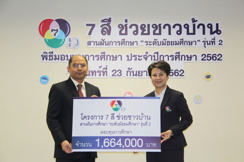 มีคุณภาพให้กับประเทศ เราจึงได้ดำเนินโครงการ 7 สีช่วยชาวบ้าน สานฝันการศึกษา มาตั้งแต่ปี 2553 ด้วยความมุ่งหวังว่าโครงการฯ ของเราจะเป็นส่วนหนึ่งที่ช่วยสร้างเยาวชนที่มีคุณภาพเพื่อตอบแทนสังคม ซึ่งในปีนี้ ช่อง 7HD มุ่งมั่นที่จะสานต่อแนวทางด้านการส่งเสริมการศึกษา ด้วยการจัดโครงการ 7 สี ช่วยชาวบ้าน สานฝันการศึกษา ‘ระดับมัธยมศึกษา’ รุ่นที่ 2 โดยในปีการศึกษา 2562 นี้ จะมีนักเรียนที่มีสิทธิ์รับทุนตามหลักเกณฑ์จำนวน 208 ทุน ทุนละ 8,000 บาท รวมเป็นเงินทั้งสิ้น 1,664,000 บาท ในนามของช่อง 7HD เราหวังเป็นอย่างยิ่งว่า ทุนการศึกษาจากโครงการฯ นี้ จะช่วยเป็นกำลังใจในการศึกษาเล่าเรียนของนักเรียนทุกคน ขอให้ตั้งมั่นอยู่ในความพยายาม ความดี และขอให้ประสบความสำเร็จในการเรียนต่อไปนะคะ”