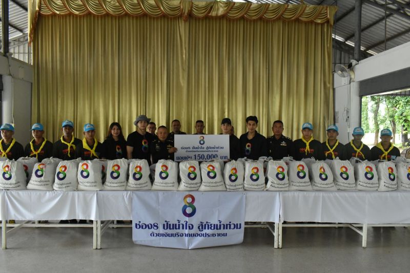 สถานีโทรทัศน์ช่อง 8 ภายใต้ โครงการ“ช่อง8 ปันน้ำใจสู้ภัยน้ำท่วม”ร่วมกับมณฑลทหารบกที่ 39 จ.พิษณุโลก และ กองบัญชาการช่วยรบที่3 ค่ายเอกาทศรศ รับผิดชอบพื้นที่น้ำท่วมจ.สุโขทัย พร้อมนำทีมโดย ดารานักแสดง ช่อง 8 ได้แก่ ฟลุค-จิระ ด่านบวรเกียรติ, เอี๊ยง-สิทธา สภานุชาติ และ มังกร ปภาวิน หงษ์ขจร ลงพื้นที่ฟื้นฟู บริจาคเงิน ช่วยเหลือผู้ประสบอุทกภัยอำเภอวังทอง จังหวัดพิษณุโลก และ อำเภอเมืองสุโขทัย จ.สุโขทัย โดยมอบเงินบริจาค ให้กับ บ้านผู้ประสบอุทกภัย พร้อมนำถุงยังชีพเครื่องอุปโภคบริโภค กว่า 300 ชุด ซึ่งเป็นเงินบริจาคของพี่ประชาชนที่ร่วมกันบริจาคผ่านโครงการ “ช่อง8 ปันน้ำใจสู้ภัยน้ำท่วม ” จำนวน 300,000 บาท โดยมี พลตรีทวีศักดิ์ วงศ์ทวีทรัพย์ผู้บัญชาการมณฑลทหารบกที่ 39 จ.พิษณุโลก และ นายไมตรี ไตรติลานันท์ ผู้ว่าราชการจังหวัดสุโขทัย เป็นตัวแทนนำชาวบ้านที่เป็นผู้ประสบภัยมากกว่า 100 คน มารับมอบ และพูดคุยเพื่อสร้างขวัญและกำลังใจ พร้อม ผู้บัญชาการกองบัญชาการช่วยรบที่3รับผิดชอบพื้นที่น้ำท่วม จ.สุโขทัย กองทัพบก รับมอบเงินบริจาคในครั้งนี้ โดย หลังจากนั้น ทั้ง3 หนุ่ม ฟลุค เอี๊ยง มังกร ได้ร่วมร้องเพลง สร้างความสุข ขวัญ และ กำลังใจ ให้กับ ผู้ประสบภัย อิ่มบุญกันไปถ้วนหน้า