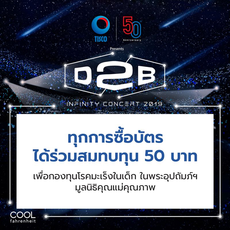 ไม่ใช่จะเป็นแค่คอนเสิร์ตที่ทุกคนรอคอยซะแล้ว เพราะ 2 หนุ่มบอยแบนด์ “แดน-วรเวช ดานุวงศ์ และ บีม-กวี ตันจรารักษ์” เผยว่างาน “ธนาคารทิสโก้ Presents D2B Infinity Concert 2019″ นี้ นอกจากแฟนเพลงจะได้มาร่วมสร้างปรากฏการณ์แห่งความรักที่ไม่มีวันสิ้นสุดไปพร้อมกันแล้ว ยังจะได้ร่วมสมทบทุนทุกบัตรๆ ละ 50 บาท เพื่อกองทุนโรคมะเร็งในเด็ก ในพระอุปถัมภ์มูลนิธิคุณแม่คุณภาพ อีกด้วย..อย่าลืมมาร่วมบุญกันที่ ไทยทิคเก็ตเมเจอร์ทุกสาขา และทางออนไลน์ www.thaiticketmajor.com เปิดขายบัตรในวันศุกร์ที่ 27 ก.ย.นี้เวลา 10.00 น. เป็นต้นไปนะครับ…