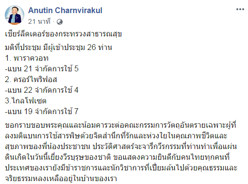 Anutin thanked “every party which supports the banning of the three pesticides” and “congratulated Thais for having government officials and academics who have ethics and integrity”.