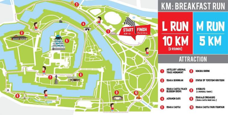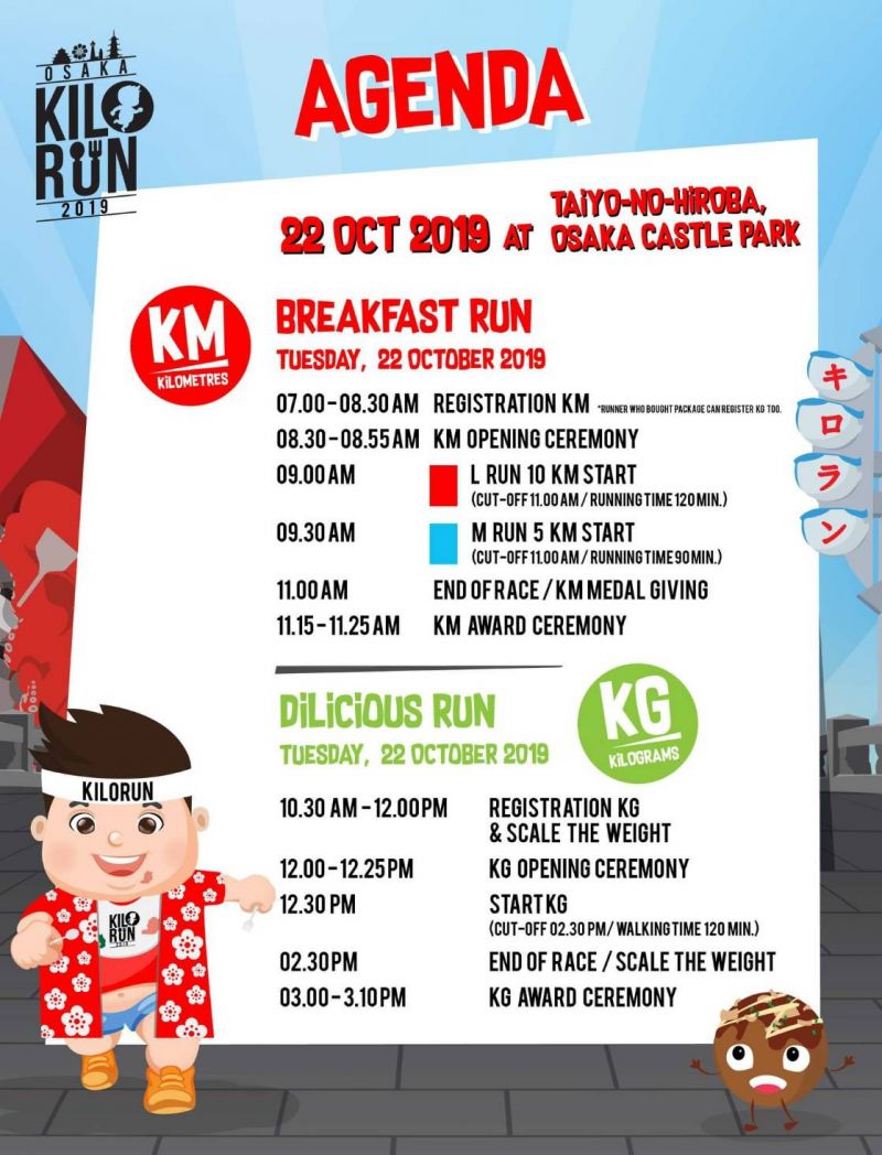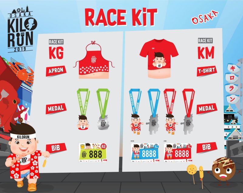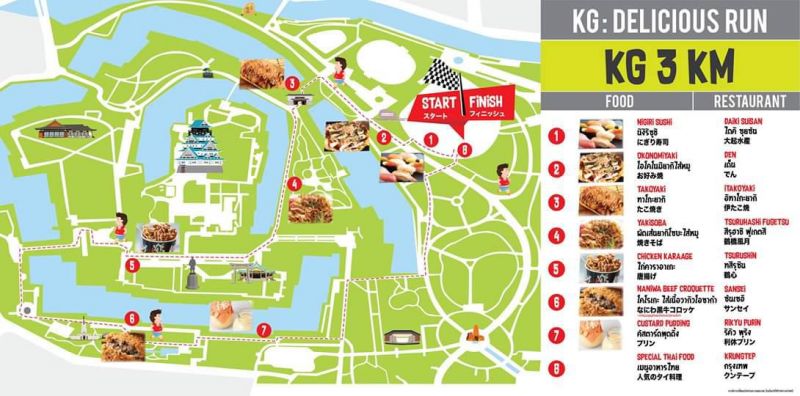 โดยมีการจัดแข่งขัน 2 ประเภทคือ 1. KM: Breakfast Runวิ่งในสวนสูดอากาศบริสุทธิ์ยามเช้าและโพสต์ท่าวิ่งถ่ายภาพติดฉากหลังปราสาทโอซาก้ากับ 2 ระยะทางคือLRUN 10 กิโลเมตรและ M RUN 5 กิโลเมตร และ2. KG: Delicious Run อิ่มท้องแบบจุกๆกับอาหารญี่ปุ่นแท้ในยามบ่ายที่ยกขบวน7จานเด็ดอาหารญี่ปุ่นแท้มาเสิร์ฟถึงในสวนปราสาทโอซาก้า ได้แก่ซูชิพรีเมี่ยม(Nigiri Sushi) จากDaiki Suisanร้านอาหารทะเลเก่าแก่ที่ก่อตั้งมาแล้วกว่า 40 ปี, ทาโกยากิ (Takoyaki) ระดับตำนานจากร้าน ITAKOYAKI กับวัตถุดิบสไตล์อิตาเลี่ยน, ยากิโซบะ (Yakisoba) อันดับ 1 จาก TSURUHASHI FUGETSU ร้านใหญ่ที่สุดในประเทศญี่ปุ่นที่มีสาขาทั้งในและต่างประเทศกว่า 90 สาขา, ครอกเก้เนิ้อวากิว (Naniwa Beef Croquette) กรอบนอกฉ่ำในจากร้าน SANSEI,ไก่คาราเกะ(Chicken Karaage)ที่มาพร้อมรางวัลการันตีจากร้าน TSURUSHIN, โอโคโนมิยากิ (Okonomiyaki) จากสุดยอดวัตถุดิบของร้าน DEN, พุดดิ้งคัสตาร์ด (Custard Pudding) เข้มข้นจากไข่คุณภาพจากร้าน RIKYU PURIN ปะทะเมนูเซอร์ไพร์สอาหารไทยชื่อดัง“ผัดกระเพรา”ที่ชาวญี่ปุ่นและชาวต่างชาติชื่นชอบเสิร์ฟให้กับผู้ลงสนามได้ลิ้มลองทั้งยังเป็นการแลกเปลี่ยนวัฒนธรรมด้านอาหารประจำชาติไทย-ญี่ปุ่น นอกจาก Race Kit เสื้อวิ่ง-KM ผ้ากันเปื้อน-KG เหรียญที่ระลึก ลวดลายเก๋ไก๋น่ารักจากมาสคอตน้องเบาหวิวแล้ว สายการบินแอร์เอเชีย เอ็กซ์ ยังได้ร่วมสนับสนุนรางวัลให้กับผู้ชนะเลิศชายและหญิงทุกประเภทด้วยมอบตั๋วเครื่องบินไป-กลับกรุงเทพ-โอซาก้า 1รางวัล 2 ที่นั่งด้วย
