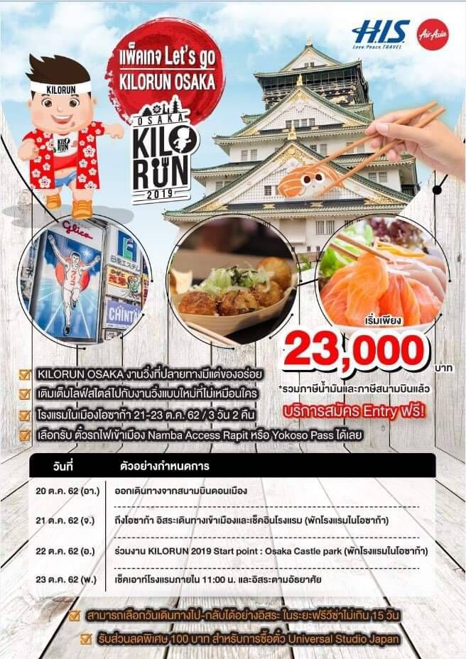 สนใจสัมผัสประสบการณ์KILORUN OSAKA 2019 จัดงานวันที่ 22 ตุลาคม 2562 นี้จองบัตรที่ WWW.KILORUN.COM ราคาแพ็คเกจรวมที่พัก,การเดินทางและบัตรร่วมงานLet’s go KILORUN OSAKA จาก H.I.S. Tours ในราคาเริ่มต้น 23,000 บาท หรือข้อมูลเพิ่มเติมที่ FACEBOOK, LINE, TWITTER : @Kilorunและ IG: KILORUN2019ร่วมสนับสนุนโดย Thailand Authority of Tourism, Osaka Convention & Tourism Bureau, AirAsia, JR WEST, Cerezo Osaka, Asics, MONO 29