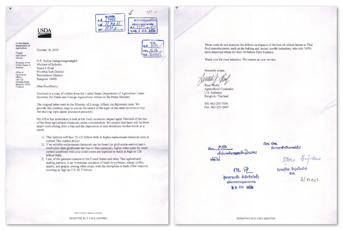 Ted McKinney, the undersecretary of Trade and Foreign Agricultural Affairs of the US Department of Agriculture, wrote to Prime Minister General Prayut Chan-o-cha and nine other ministers asking the government to reconsider the ban on pesticide glyphosate. He also said that the National Committee on Hazardous Substances had not made the decision based on scientific evidence. The letter was dated October 18.