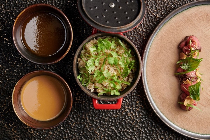 The set menu comprises eight courses, beginning with tantalising bites of “street food”. The set dinner also features tom yam served with prawn crackers and Thai taco, scallop ceviche with ginger and yuzu sorbet, tom kha with wild mushrooms and truffle, yellow crab curry, Wagyu beef served with soy sesame butter and baked rice with five spices.