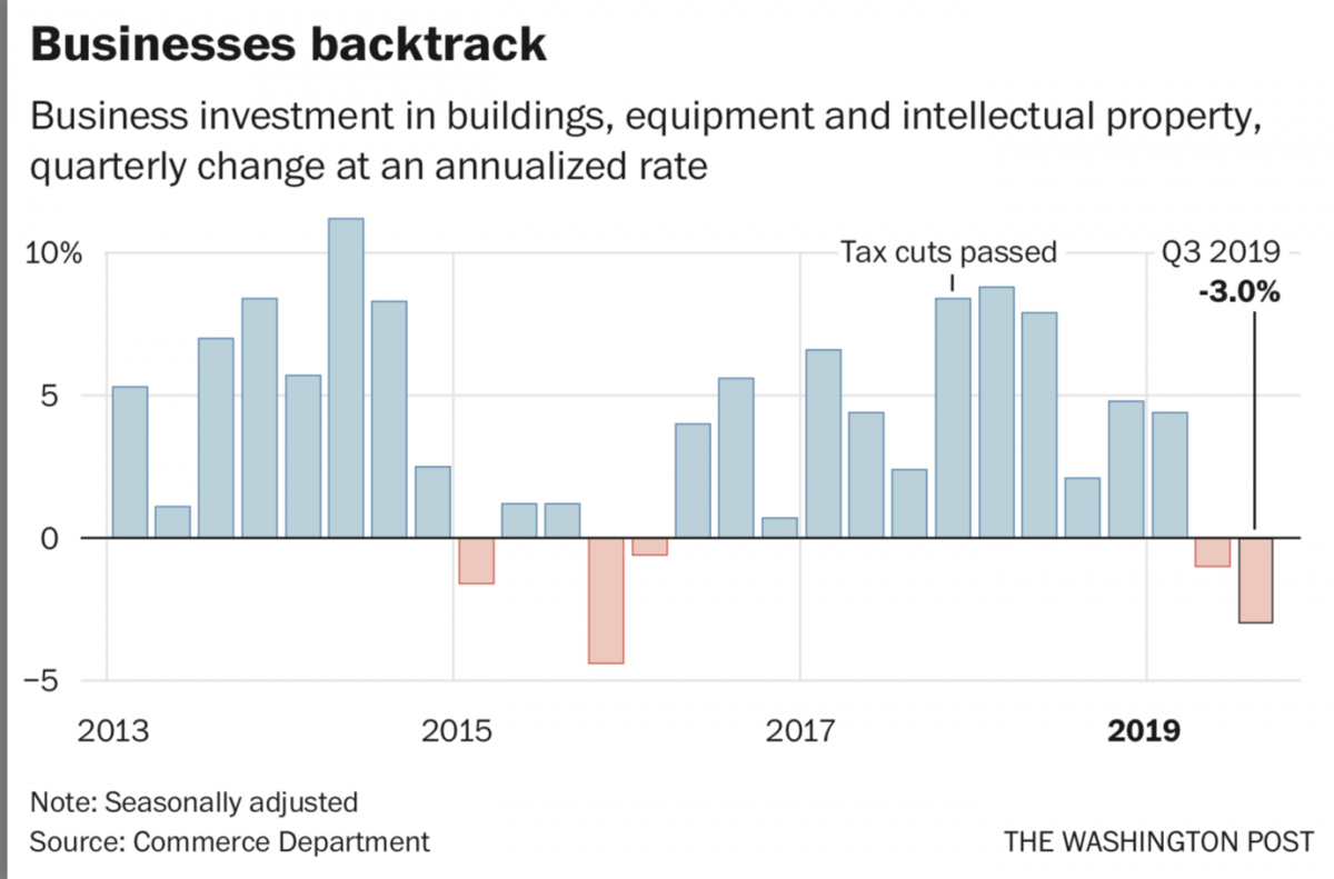 Consumer spending continues to power the economy, but business investment has now contracted for six straight months, falling 3% in the third quarter, the biggest drop since the end of 2015. A number of companies have said they are pulling back because of economic uncertainty, particularly related to whether trade rules will be shifting with China and other countries. Spending on both structures and equipment was deeply negative.