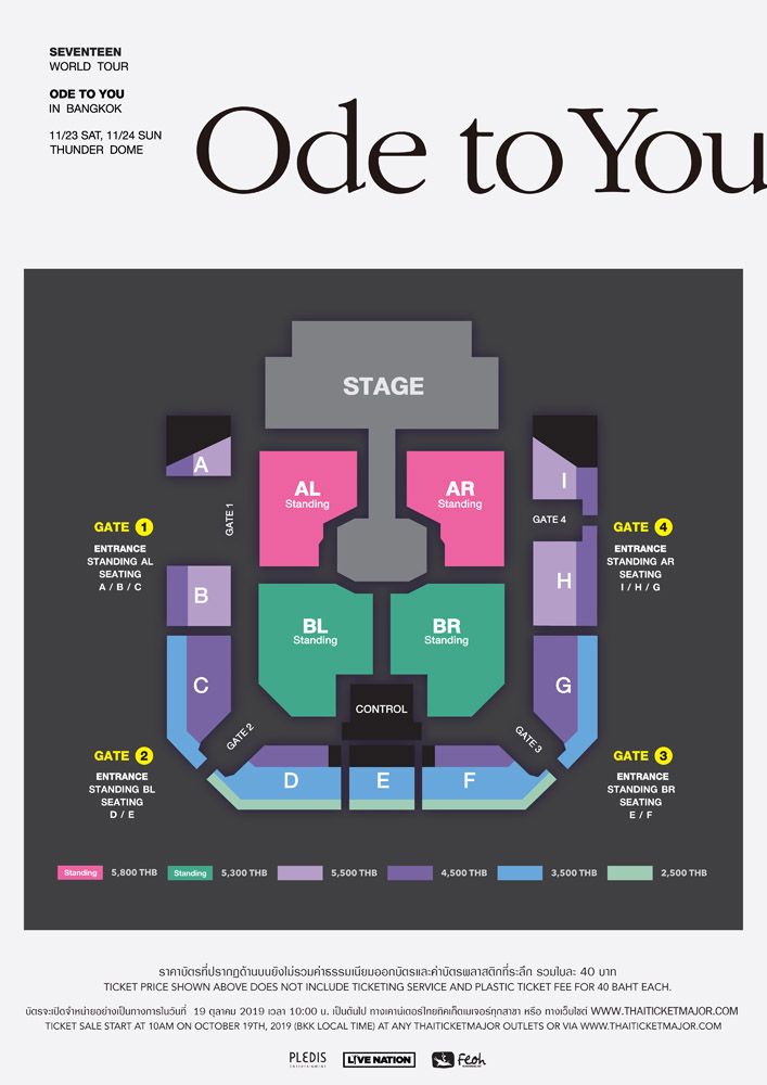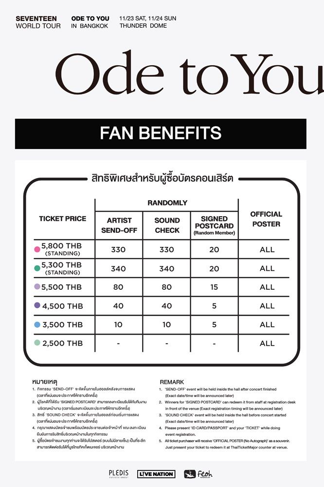 “สวัสดีครับ พวกเรา SEVENTEEN! พวกเรามีข่าวมาบอกกะรัตไทยทุกคนที่กำลังรออยู่ครับ (ปรบมือ) ใช่แล้ว พวกคุณไม่ต้องรอกันอีกต่อไป! พวกเรา SEVENTEEN กำลังจะมีคอนเสิร์ตถึง 2 วันด้วยกัน วันที่ 23 และ 24 พฤศจิกายนนี้ ที่ ธันเดอร์โดม กรุงเทพฯ (ปรบมือ) พวกเรากำลังเตรียมตัวกันอย่างหนักให้เท่ากับความคิดถึงของพวกเราที่มีต่อทุกคน ดังนั้นพวกเราจะไปเจอทุกคนใน SEVENTEEN WORLD TOUR <ODE TO YOU> IN BANGKOK! กันนะครับ ขอบคุณครับ (ภาษาไทย)”