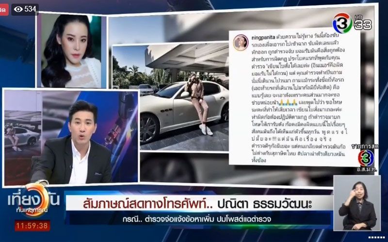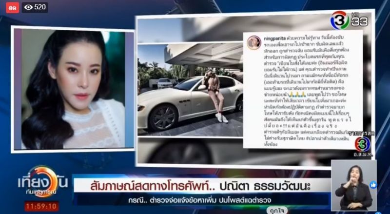 ล่าสุด “หนิง ปณิตา” ได้ให้สัมภาษณ์เปิดใจกลางรายการ “เที่ยงวันทันเหตุการณ์” ซึ่งออกอากาศทุกวันจันทร์-ศุกร์ เวลา 11.20-12.20 น. ช่อง 3 ตามสโลแกน “รวมทุกความสุข ที่นี่ที่เดียว ช่อง 3 กด 33” ดำเนินรายการโดย “หนุ่ม-กรรชัย กำเนิดพลอย” และ “ดร.หมวย-อริสรา กำธรเจริญ” แจงทุกข้อกรณีที่เกิดขึ้นว่า “ปกติไม่ค่อยขับรถเองเท่าไหร่เลยไม่รู้เส้นทาง ขับรถผิดกฎ ตำรวจก็เรียก หนิงก็บอกว่าเขียนใบสั่งได้เลยค่ะ ใบขับขี่หนิงไม่ได้พกมา เพราะหนิงปกติไม่ค่อยได้ขับรถเอง คือ ในส่วนตัวหนิงอะไรที่ทำผิดหนิง ยอมรับ ผิดก็ต้องโดนลงโทษ เจ้าหน้าที่ก็เดินวนรถ ในมุมของหนิง หนิงรับผิดทุกกรณี ยอมรับโดยไม่มีข้อโต้แย้งใดๆ ส่วนเรื่องสังคมตีกลับ เรื่องรถมาเซราติ ก็เข้าใจได้ที่ตำรวจไม่รู้จักยี่ห้อรถ การลงไอจีของหนิง หนิงใช้ความรู้สึกส่วนตัวของหนิง หนิงมีประสบการณ์บนท้องถนน หนิงยอมรับผิดทุกประเด็น แต่เราแค่แบบทำไมต้องตรงค้นนู้นตรงนี้ ในเมื่อเรายอมรับแล้ว