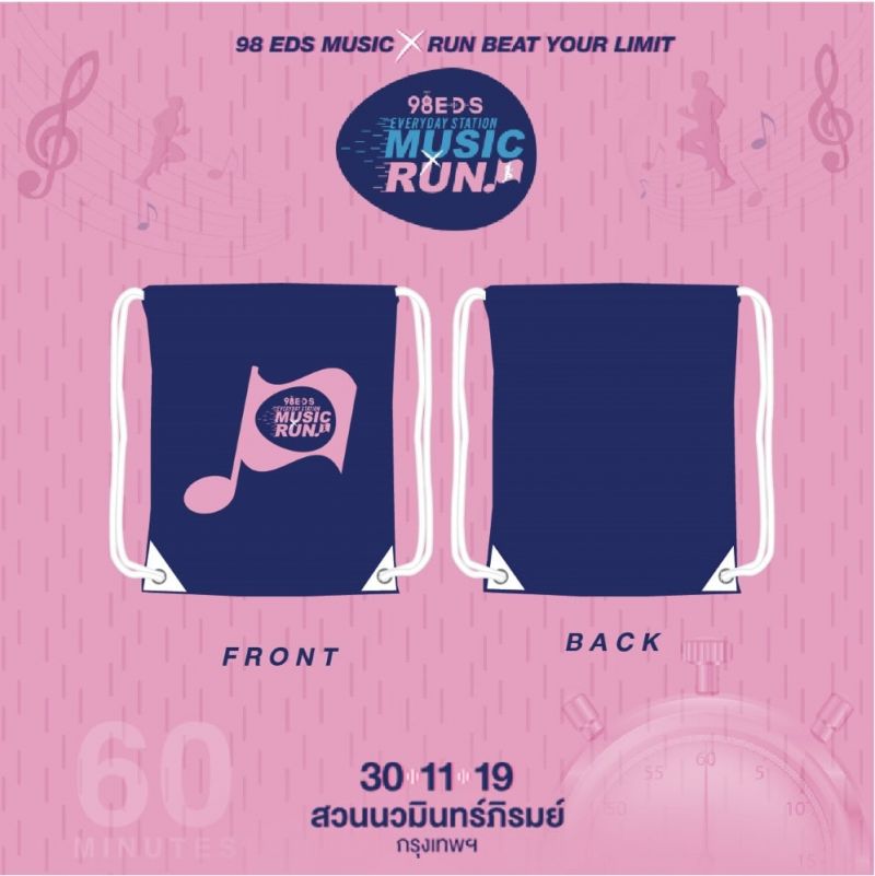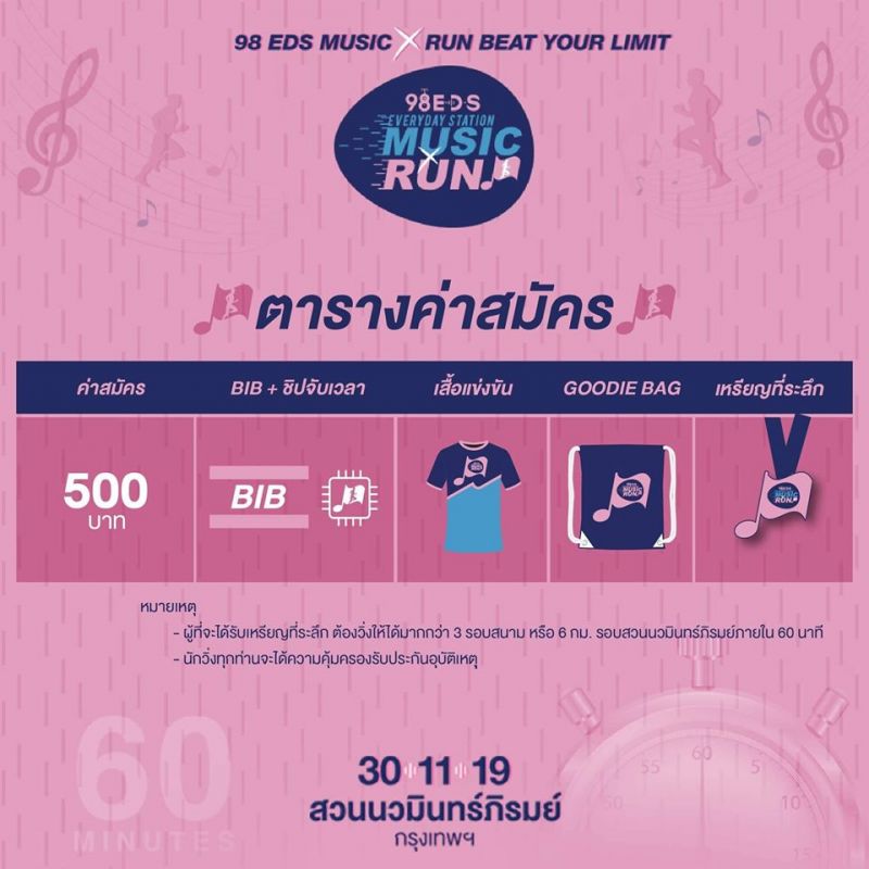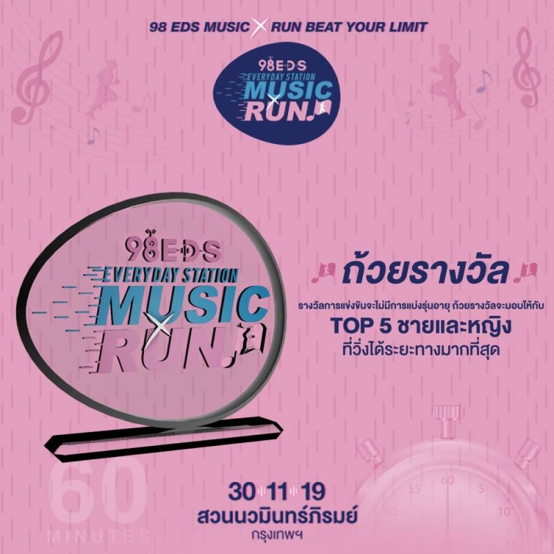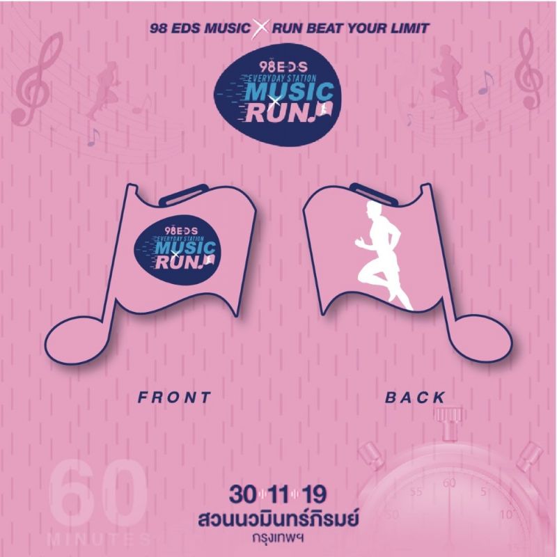 ถ้าคุณเป็นคนหนึ่งที่มีเสียงเพลงในหัวใจ… 98 EDS Everyday Station ขอชวนคุณมาเริ่มต้น ก้าวข้ามทำระยะ ชนะใจตัวเอง “EDS Music Run” Beat Your Limit 60 นาทีของจังหวะเพลงฮิต เอาชนะลิมิตตัวเองกับสไตล์การวิ่งรูปแบบใหม่ ที่จะออกวิ่งพร้อมกับโน๊ตเพลงตัวแรกที่ได้ยิน ไปจนถึงโน๊ตเพลงตัวสุดท้าย ลองดูกันว่า 60 นาที ที่เต็มไปด้วยเพลงเพราะ non-stop ในรูปแบบเมดเล่ย์ จะทำให้คุณเอาชนะลิมิตตัวเอง วิ่งได้ระยะทางกี่รอบสนามแดดร่มลมตก เสาร์ที่ 30 พฤศจิกายน 2562 เวลา 18.00 น. พบกัน ณ สวนนวมินทร์ภิรมย์ กรุงเทพฯ