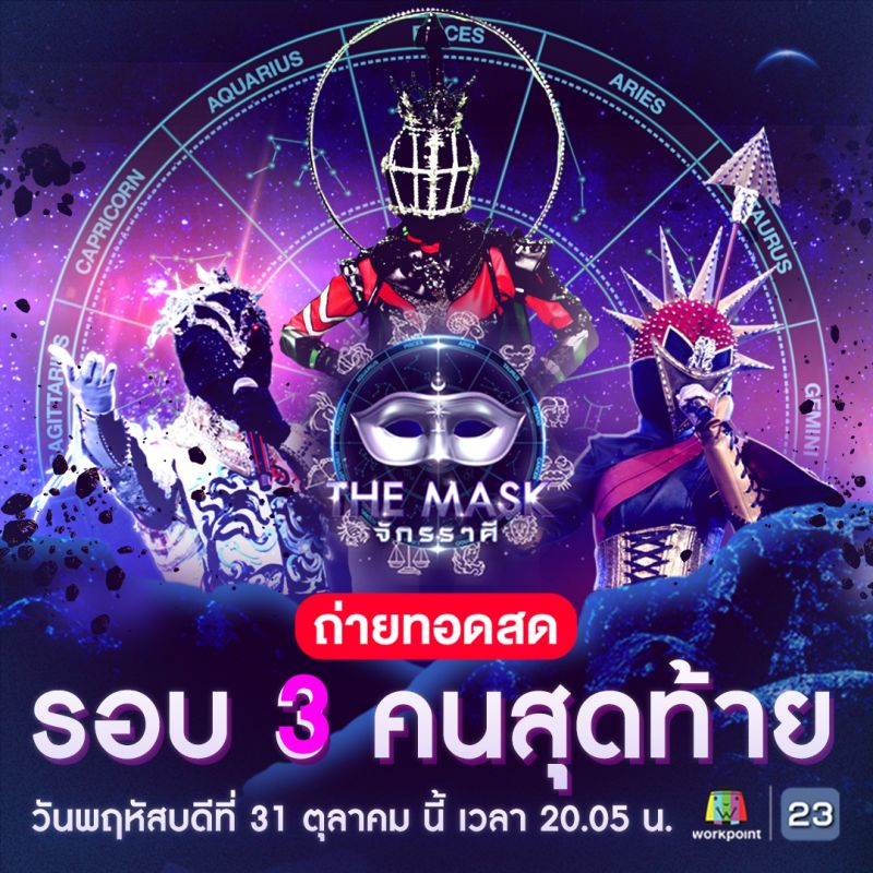 ซึ่งในรอบถ่ายทอดสดนี้ จะมีเพียง 2 หน้ากากเท่านั้นที่ได้ผ่านเข้ารอบต่อไป เพื่อเข้าไปสู่รอบชิงแชมป์ ใครจะได้เป็นหน้ากากหนึ่งเดียวที่ได้ครอบครองบัลลังก์แชมป์ ว่าแต่ 3 หน้ากากจะเตรียมโชว์มาแนวไหนนั้น บอกเลยว่าไม่ธรรมดาแน่นอน ส่วนการตัดสินจะมาจากผลโหวตของผู้ชมทั่วประเทศ มาลุ้นและเชียร์ให้หน้ากากที่คุณชื่นชอบไปพร้อมกันใน “The Maskจักรราศี” วันพฤหัสบดีที่ 31 ตุลาคมนี้ เวลา 20.05 น. เป็นต้นไป ทางช่องเวิร์คพอยท์23