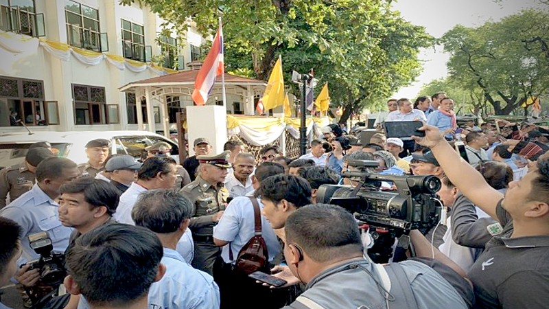 More than 100 members of the Thai Public Taxi Association and the Task Force for Organising Service Vehicles at Suvarnabhumi Airport blocked the entrance to the Transport Ministry on Thursday (November 7) to demand a response to their request for hikes in fares and luggage-handling fees but dispersed around 3.40pm, apparently satisfied with the results of negotiations with Ministry representatives announced by association president Pallop Chayinthu.