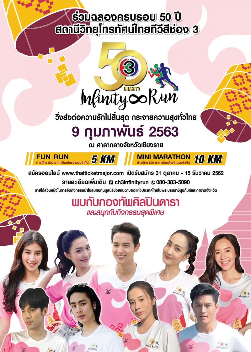 โดยประเดิมกิจกรรมแรกคือ“Channel 3 Charity Infinity Run”ในคอนเซปต์“วิ่งส่งต่อความรักไม่สิ้นสุดกระจายความสุขทั่วไทย”เป็นการรวมพลังคนไทยทั้ง 5 ภูมิภาคมาร่วมวิ่งการกุศลใน 5 จังหวัด เริ่มจากจันทบุรี(19 มกราคม 2563), อุบลราชธานี(26 มกราคม 2563), เชียงราย(9 กุมภาพันธ์ 2563), ตรัง(16 กุมภาพันธ์ 2563) และ สุพรรณบุรี(23 กุมภาพันธ์ 2563)เพื่อเป็นกระตุ้นให้ประชาชนหันมาสนใจการออกกำลังกายด้วยการวิ่ง โดยสิ่งที่พิเศษกว่างานวิ่งอื่น ๆ คือจะมีเหล่านักแสดงยอดนิยมจากช่อง 3 มาร่วมวิ่งไปด้วยกันกับผู้วิ่ง อาทิณเดชน์-คูกิมิยะ, หมาก-ปริญ, โป๊บ-ธนวรรธน์,มาริโอ้ เมาเร่อ, บอย-ปกรณ์, เกรท-วรินทร, อเล็กซ์-เรนเดลล์,ปั้นจั่น-ปรมะ, เจมส์ มาร์, เจมส์-จิรายุ, เด่นคุณ งามเนตร, บอมบ์-ธนิน, หลุยส์ สก๊อตต์,เพื่อน-คณิน,มาสุ จรรยางค์ดีกุล,เต้ย-พงศกร, เคน-ภูภูมิ, หมอก้อง-สรวิชญญ์, ท๊อป-จรณ, กองทัพ-พีค, ไม้-วฤษฎิ์, แชมป์-ชนาธิป, ภณ-ณวัสน์, ญาญ่า-อุรัสยา, เบลล่า-ราณี, แต้ว-ณฐพร,คิมเบอร์ลี่, มิ๊นต์-ชาลิดา, มิว-นิษฐา, เต้ย-จรินทร์พร, เก้า-สุภัสสรา, น้ำตาล-พิจักขณา, ชิบปี้-ศิรินทร์, ณิชา-ณัฏฐณิชา, จีน่า-ญีนา, บัว-นลินทิพย์,พรีม-รณิดาและ อุ้ม-อิษยา เป็นต้น