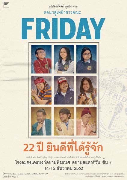 โดยพวกเขาของชวนศิษย์เก่าศิษย์ปัจจุบันและศิษย์ใหม่มาร่วมเลี้ยงรุ่นไปพร้อมกันใน คอนเสิร์ต “ฟรายเดย์ 22 ปี ยินดีที่ได้รู้จัก”ที่จัดให้แบบเต็มๆ 2 รอบการแสดงในวันเสาร์ที่ 14-วันอาทิตย์ที่ 15 ธันวาคม 2562 ณ โรงละครเคแบงก์สยามพิฆเนศ สยามสแควร์วันชั้น 7 พร้อมจำหน่ายบัตรในวันที่ 1 พฤศจิกายน 2562 ที่ Ticketmelon