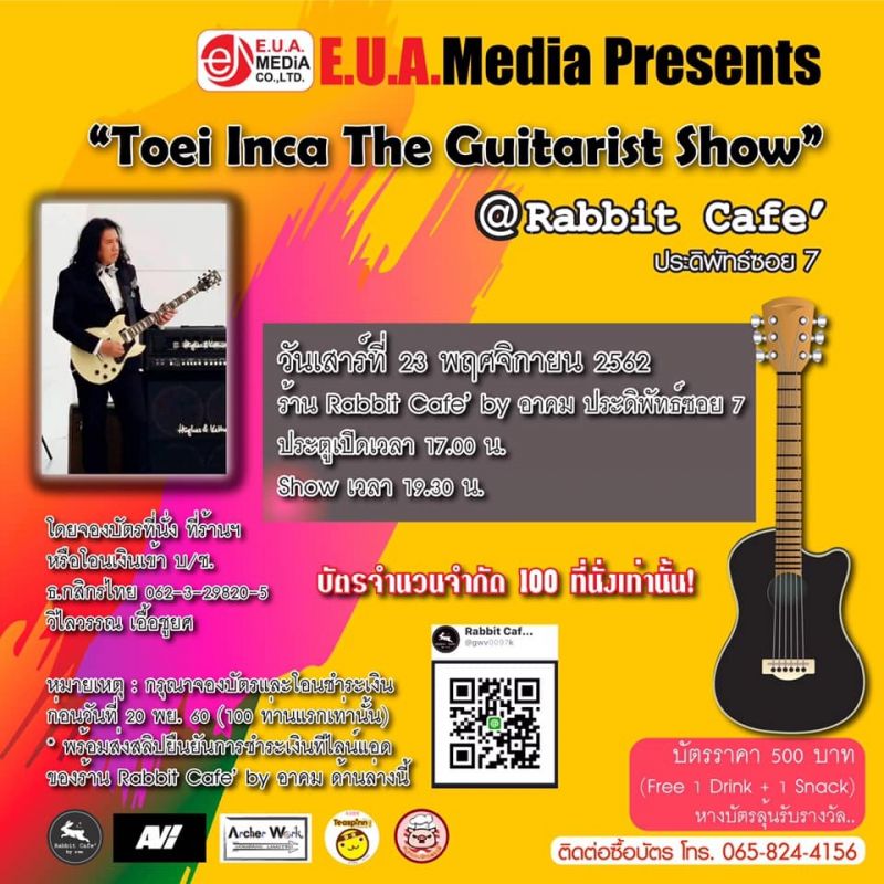 แล้วพบกันในคอนเสิร์ตเดี่ยวกีตาร์ ‘Toei Inca The Guitarist Show’ ณ Rabbit Cafe’ ประดิพัทธ์ซอย 7 ในวันเสาร์ที่ 23 พฤศจิกายน 2562 ตั้งแต่เวลา 17.00 น.โดยเริ่มโชว์ในเวลา 19.30 น.สามารถซื้อบัตรได้ทางเฟสบุ๊ค Rabbit Cafe’ by อาคม หรือติดต่อได้ที่เบอร์ 065-8244156 ในราคา 500 บาท Free 1Drink +1Snack หางบัตรลุ้นรับรางวัล โดยบัตรมีจำนวนจำกัดเพียงแค่ 100 ที่นั่งเท่านั้น !!