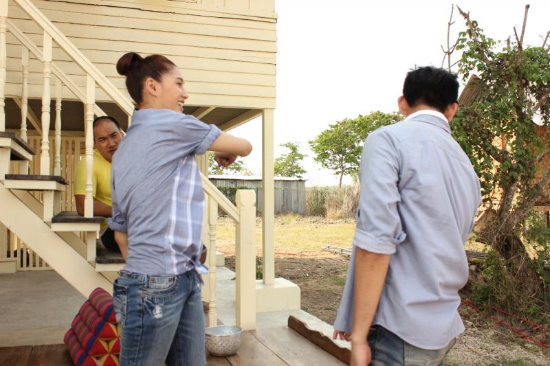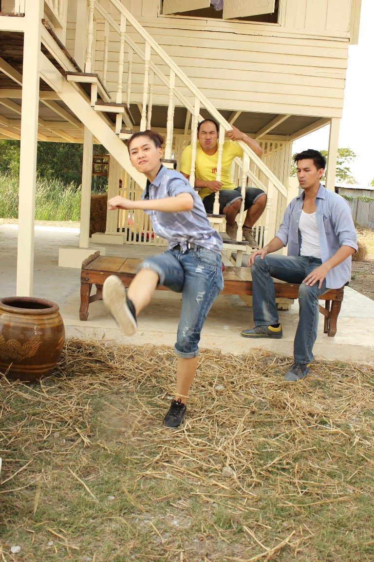 เข้าไปที่บ้านถึก เพราะอยากให้ทั้งคู่เคลียร์ใจกันซะที หลังจากที่งอนกันมานานก่อนเริ่มถ่ายฉากนี้ผู้กำกับแชมป์-อินทานนท์ รัตนกาญจน์ ให้เหมกับกวางมาซ้อมคิวกันต่อยกันก่อน เพราะวันนี้เหมต้องถูกกวางต่อยแน่นอน แต่จะทำยังไงให้เซฟที่สุด จะได้ไม่เจ็บตัวกันมาก หลังจากซ้อมกันคล่องคิวดีแล้ว ทุกฝ่ายพร้อมแล้วก็เริ่มถ่ายทำจริงทันที กวางขับมอเตอร์ไซค์เข้ามาที่บ้านเหมจนเกือบจะเหยียบขาเหม โชคดีเหมกระโดดหนีทัน จนกวางอารมณ์เสียจึงลงไปนั่งที่แคร่ใต้ถุนบ้านเหม พร้อมกับถามเหมว่ามีอะไรก็พูดมา เหมต่อว่ากวางว่าไปรับปากเป็นแฟนยอดแมน(อ๋องพัฒนะ) เพื่อช่วยให้เหมไม่ต้องโดนยึดที่นาทำไม กวางบอกว่าเป็นแฟนได้เดี๋ยวก็เลิก เหมกลัวว่าถ้าวันนึงอ๋องคิดไม่ดีกับกวางขึ้นมากวางคงตกเป็นของอ๋องแน่ๆ เหมพูดด้วยความเป็นห่วงแต่หารู้ไม่ว่าทำเอากวางเขินหน้าแดงแจ๋…ลืมตัวพลั้งหมัดต่อยเข้าหน้าเหมอย่างจัง จนเหมลงไปกองกับพื้น โดยมีบ๊วยนั่งลุ้นให้กำลังใจอยู่บนบันไดบ้าน พอเห็นลูกพี่เหมโดน