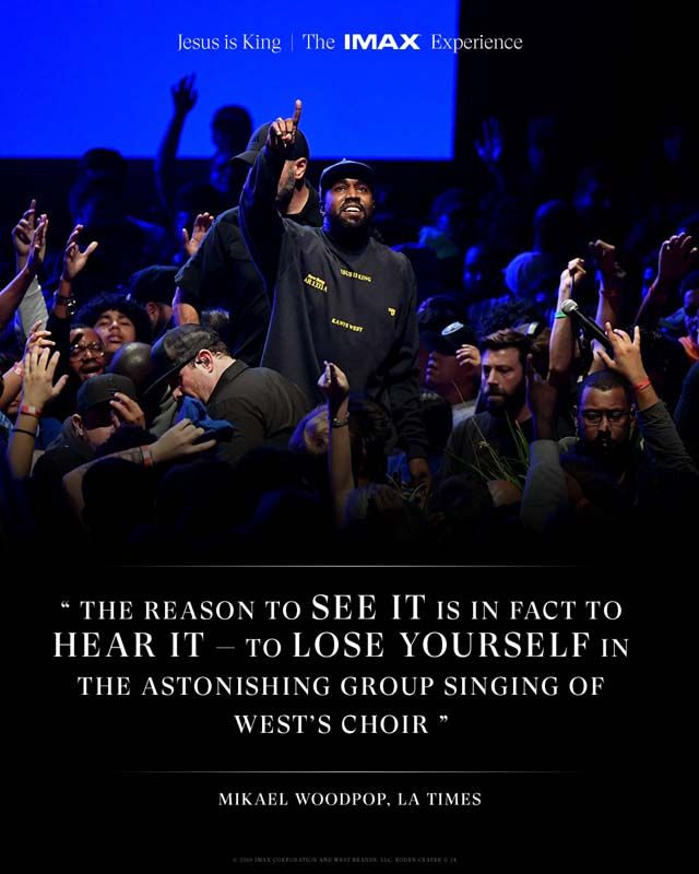 ภาพยนตร์เรื่อง “Jesus is King” ความยาว 30 นาที ผู้ชมจะได้สัมผัสการแสดงโชว์ Sunday Service การแสดงร้องเพลงสรรเสริญพระเจ้าอันโด่งดังของ คานเย เวสต์ นำมาสู่ภาพยนตร์เรื่องใหม่ล่าสุด Jesus is King กำกับโดย นิค ไนท์ หนึ่งในช่างภาพที่มีวิสัยทัศน์และทรงอิทธิพลมากที่สุดคนหนึ่งในโลก โดยคอนเซปต์คือการเอากลุ่มนักร้องประสานเสียงมาร้องเพลงฮิตร่วมสมัยของคานเยและศิลปินต่าง ๆ ทุกเช้าวันอาทิตย์ ในเวอร์ชั่น Gospel เหมือนที่ร้องในโบสถ์คริสต์ ซึ่งโชว์นี้จะผสมผสานศิลปะ ดนตรี แฟชั่น และศาสนาเข้าด้วยกัน คานเยจะเล่นดนตรีและกำกับโชว์ทุกครั้ง ซึ่งตลอด 9 เดือนที่ผ่านมามีคนดังระดับโลกไปร่วมร้องมาแล้ว